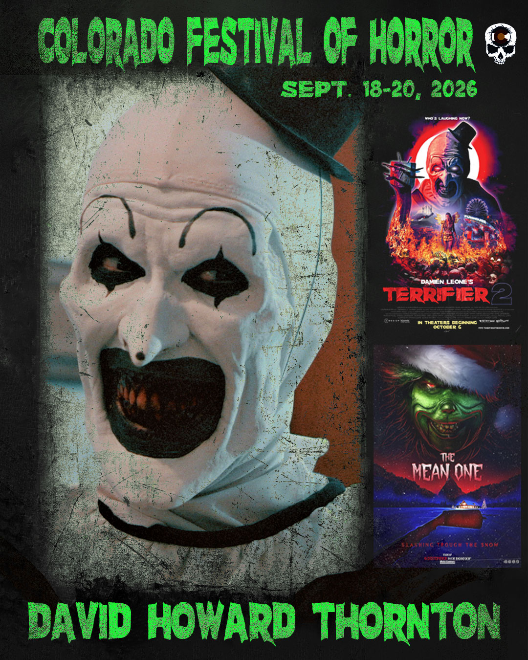 Colorado Festival of Horror is thrilled to welcome actor David Howard Thornton back for our 6th year at Colorado Festival of Horror: Clowns vs. Witches. Best known as the iconic Art the Clown from the TERRIFIER film franchise, David will be meeting fans throughout the weekend—participating in a Q&A, signing autographs, and snapping selfies. Fans will also have the opportunity to take part in a special Photo Op on Saturday, September 19th at 2pm, featuring David as Art the Clown in full makeup and costume—a must for any TERRIFIER fan!