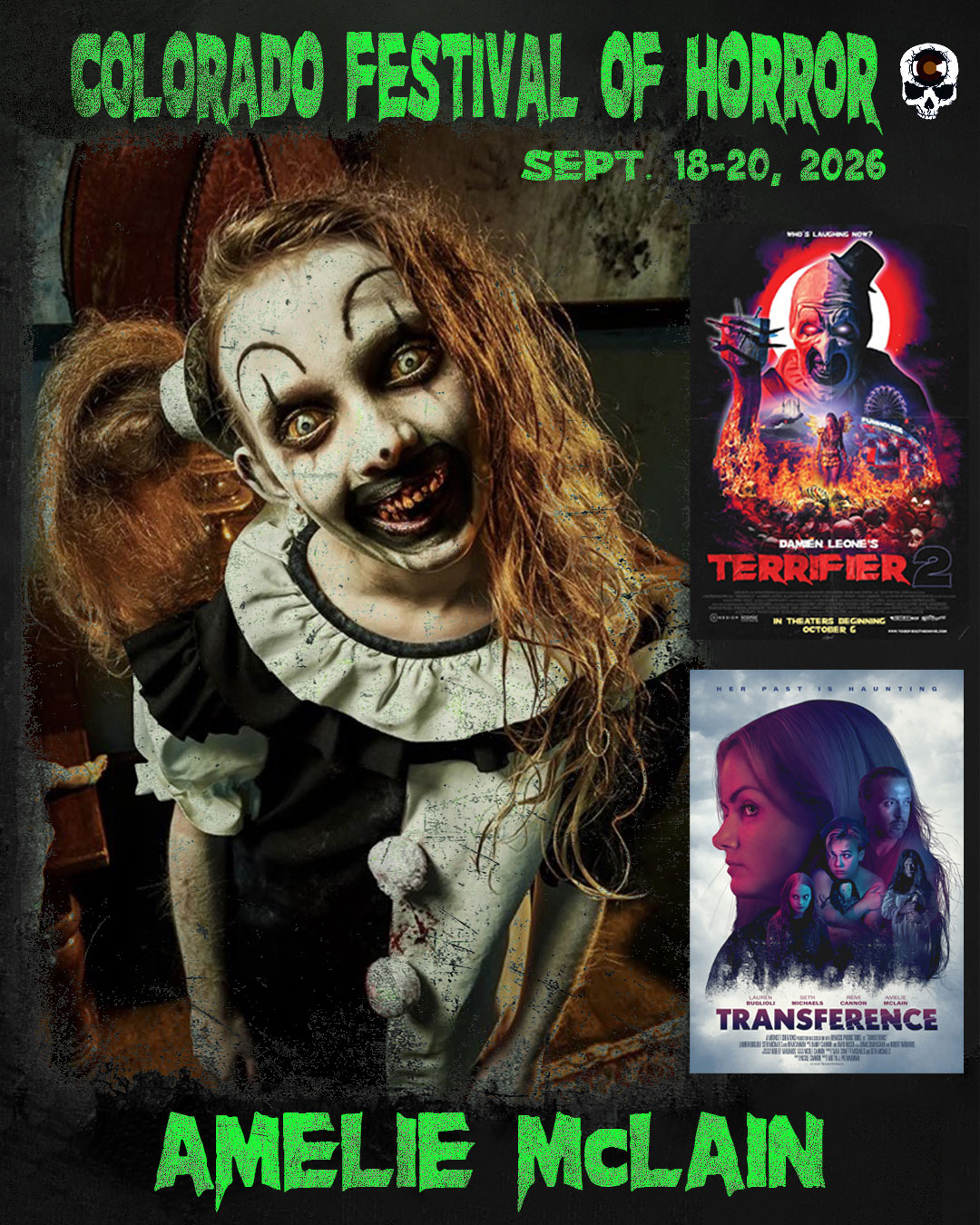 The Colorado Festival of Horror is unleashing another terrifying member of the Clown side at our 6th Annual Colorado Festival of Horror: Clowns vs. Witches! Please welcome actor Amelie McLain, best known to horror fans as the haunting Little Pale Girl from the TERRIFIER film franchise. The eerie partner-in-chaos to the infamous Art the Clown will be joining us all weekend long to meet fans, participate in a Q&A, sign autographs, snap selfies, and pose for Photo Ops.