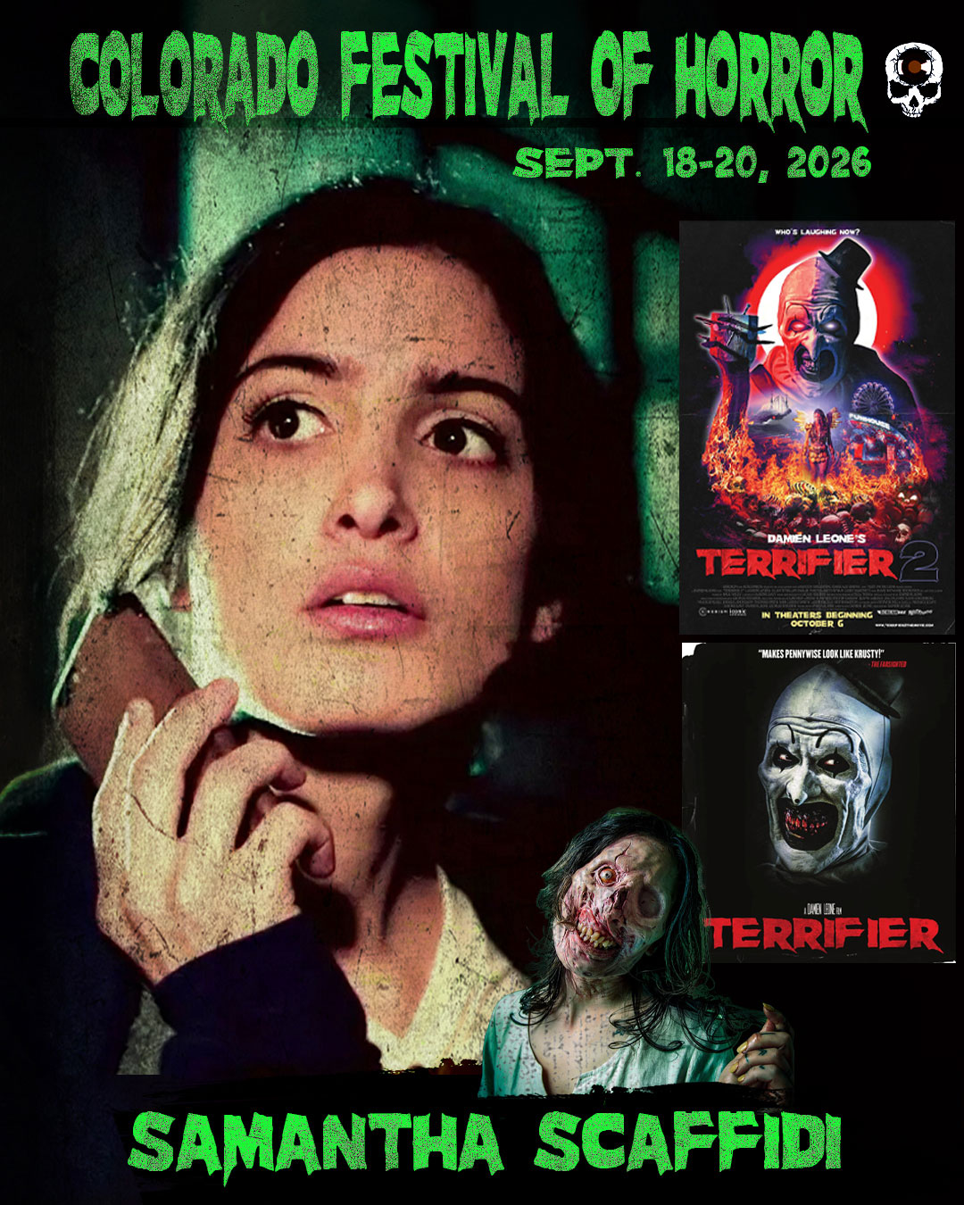 The Colorado Festival of Horror is unleashing another terrifying force for the Clown side at our 6th Annual Colorado Festival of Horror: Clowns vs. Witches! Please welcome actor Samantha Scaffidi, best known to horror fans as Victoria Heyes in the TERRIFIER film franchise. She’ll be appearing all weekend long – meeting fans, signing autographs, taking selfies, posing for Photo Ops, and sharing stories during a special Q&A you won’t want to miss.